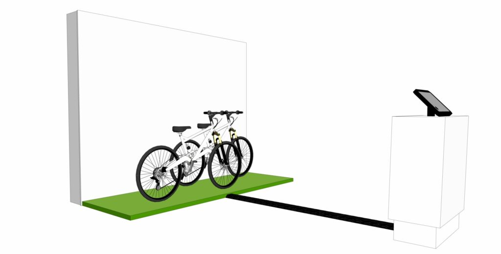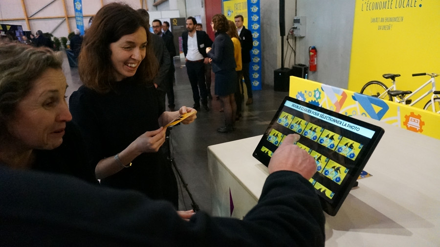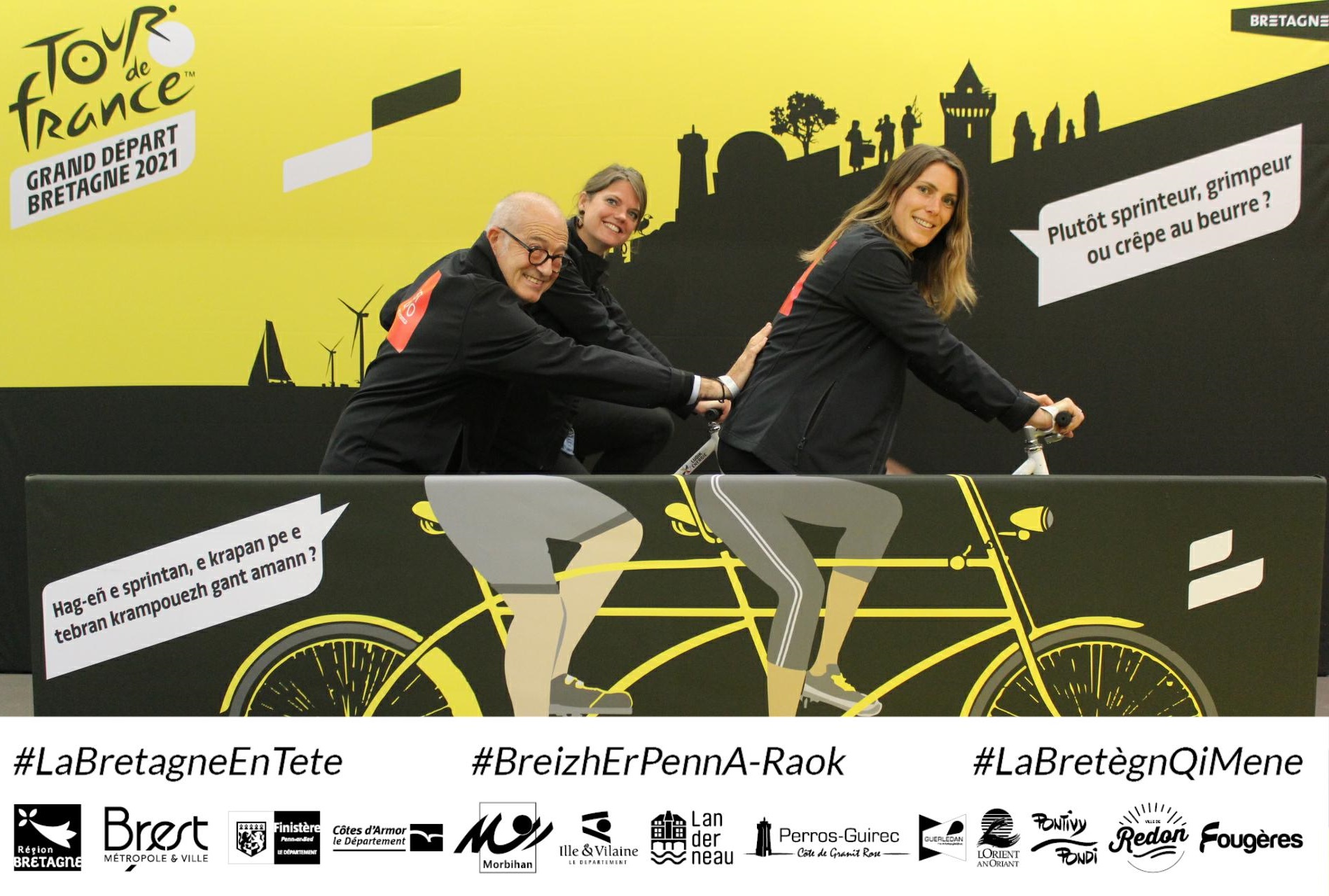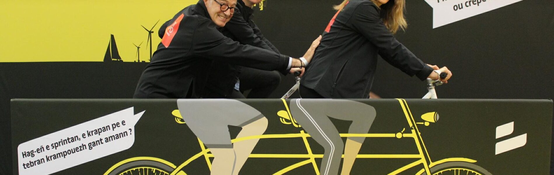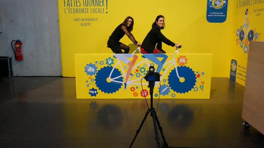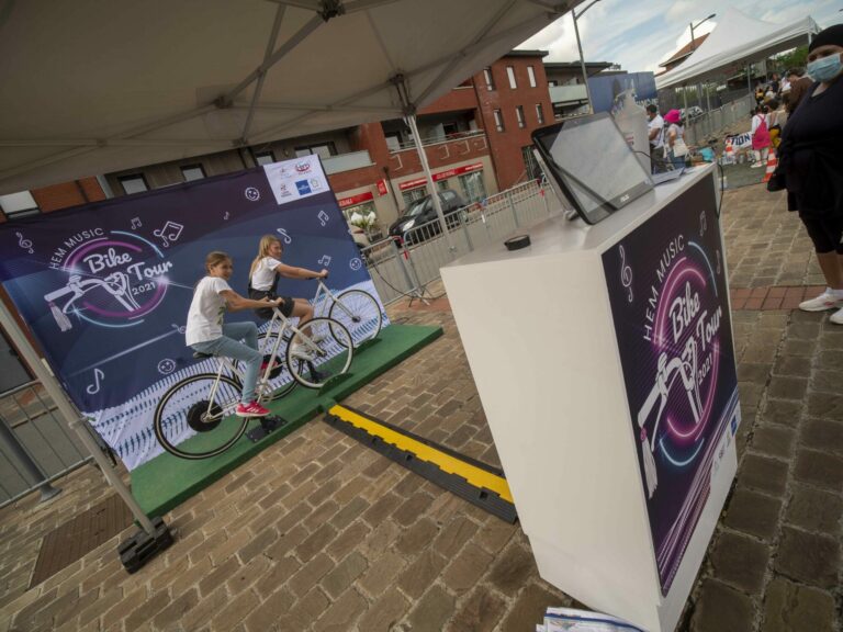 - Un binôme : Dans un décor personnalisé, 2 vélos générateurs sont reliés à une jauge d’énergie. En pédalant, les participants alimentent la borne photo interactive. Une fois la jauge d’énergie entièrement allumée, les 2 cyclistes prennent la pose. Ils peuvent ensuite s’envoyer leur photo par email.
